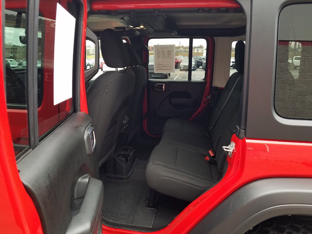 Safety Group: Blind Spot and Cross Path Detection; LED Taillamps; ParkSense Rear Park Assist System; Injection Molded Black Rear Bumper. Technology Group: 2-Door Passive Entry. Front Door Locks; Cluster 7.0" TFT Color Display; SiriusXM Satellite Radio; Air Conditioning with Auto Temp Control; Air Filtering. Quick Order Package 22W Willys: Willys; Mold in Color Bumper with Gloss Black; Speed Sensitive Power Locks; Automatic Headlamps; Leather Wrapped Steering Wheel; Deep Tint Sunscreen Windows; Black Trail Rated Badge; 4-Wheel Drive Swing Gate Decal; Black Grille; MOPAR All-Weather Floor Mats; Willys Hood Decal; Rock Protection Sill Rails; LT255/75R17C Tires; Front 1-Touch Down Power Windows; 97 MPH Vehicle Max Speed Calibration; Anti-Spin Differential Rear Axle; Power Heated Mirrors; Matte Black Jeep Badge; Security Alarm; 17" X 7.5" Moab Black Aluminum Wheels; Remote Keyless Entry; Sun Visors with Illuminated Vanity Mirrors. LED Headlamp and Fog Lamp Group: Front LED Fog Lamps; LED Premium Reflector Headlamps. 8.4" Radio and Premium Audio Group: Off-Road Info Pages; SiriusXM Traffic Plus; Alpine Premium Audio System; SiriusXM Satellite Radio; HD Radio; Uconnect 4C Navigation Radio with 8.4" Display; Rear View Auto Dim Mirror; Air Conditioning with Auto Temp Control; 1-Year SiriusXM Guardian Trial; 5-Year SiriusXM Travel Link Service; GPS Navigation; 5-Year SiriusXM Traffic Service; SiriusXM Travel Link; 4G LTE Wi-Fi Hot Spot; Emergency/assistance Call; 8.4" Touchscreen Display; Air Filtering. Quick Order Package 23W Willys. Black 3-Piece Hard Top. Alpine Premium Audio System. 2-Door Passive Entry. Front Door Locks. Firecracker Red Clearcoat. Firecracker Red Clearcoat. Corning Gorilla Glass. SiriusXM Satellite Radio. **Equipment listed is based on original vehicle build and subject to change. Please confirm the accuracy of the included equipment by calling the dealer prior to purchase.**